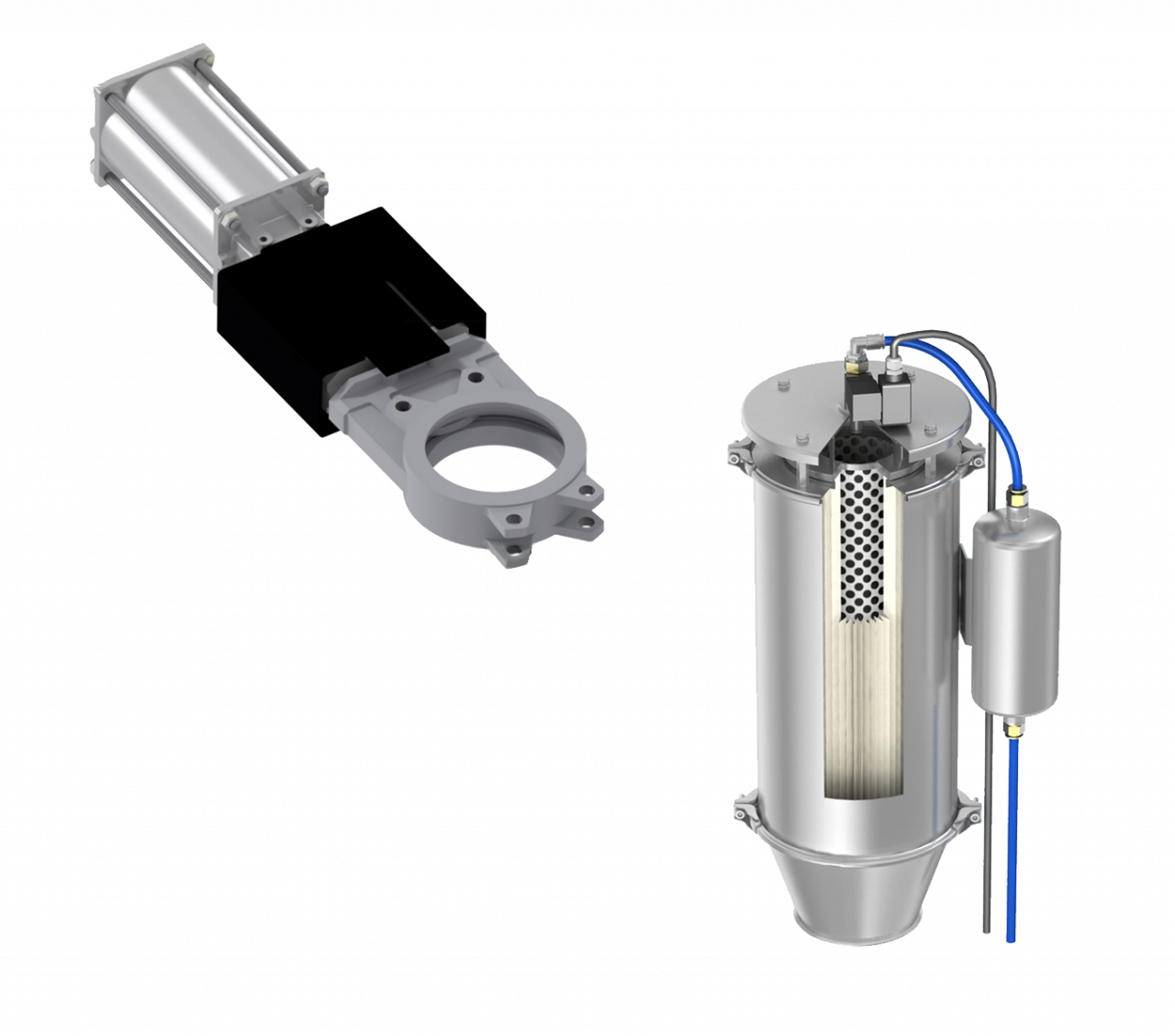 Beispielsweise der Flachschieber: ein automatischer Befüllschieber mit doppelt-wirkendem Pneumatikantrieb – ideal zur Absperrung von Schüttgutströmen, etwa bei Differenzialdosierwaagen. Oder der JetFilter: eine leistungsstarke Filterpatrone aus FDA- und GMP-konformem Polyestervlies für die effiziente Abluftreinigung bei staubigen Prozessen.